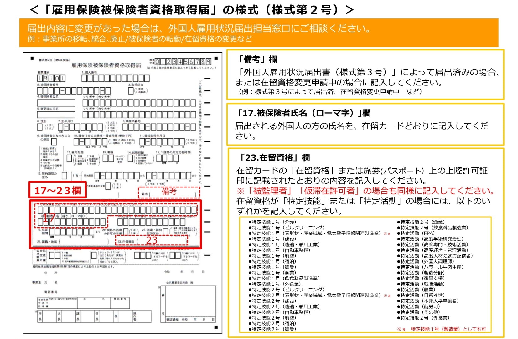 1、雇用保険に加入する場合、雇用保険資格取得届の『外国人雇用状況に関する情報欄』に国籍や在留資格を記載することで、外国人雇用状況届出の要件を兼ねることができます。