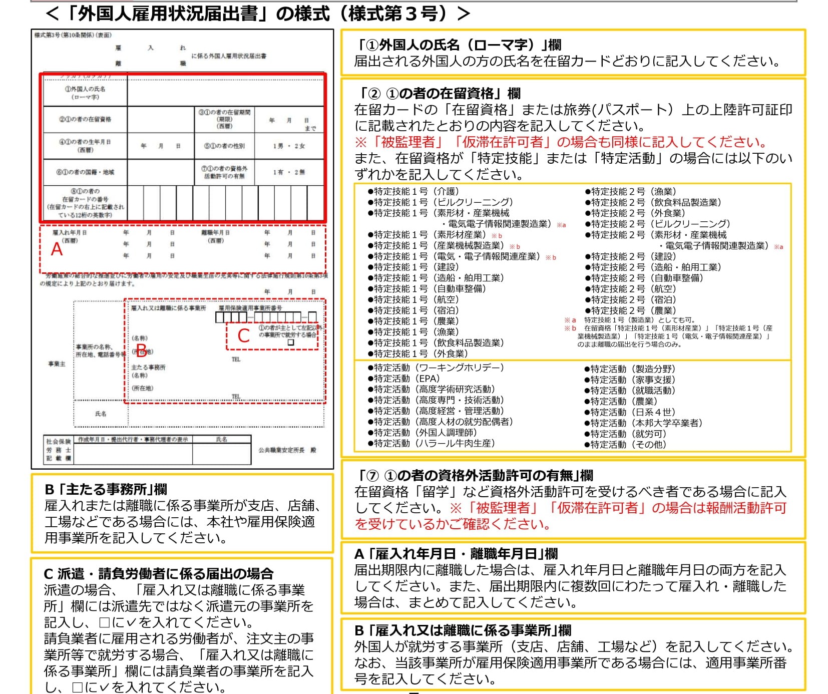 「外交ビザ」「公用ビザ」「特別永住者」以外の在留資格を持つ外国人を雇用する場合、外国人雇用状況届出書の提出が必要です。これは、全ての事業主に義務付けられている手続きで、外国人を雇い入れた場合や離職した場合にもハローワークに対して届出をします。