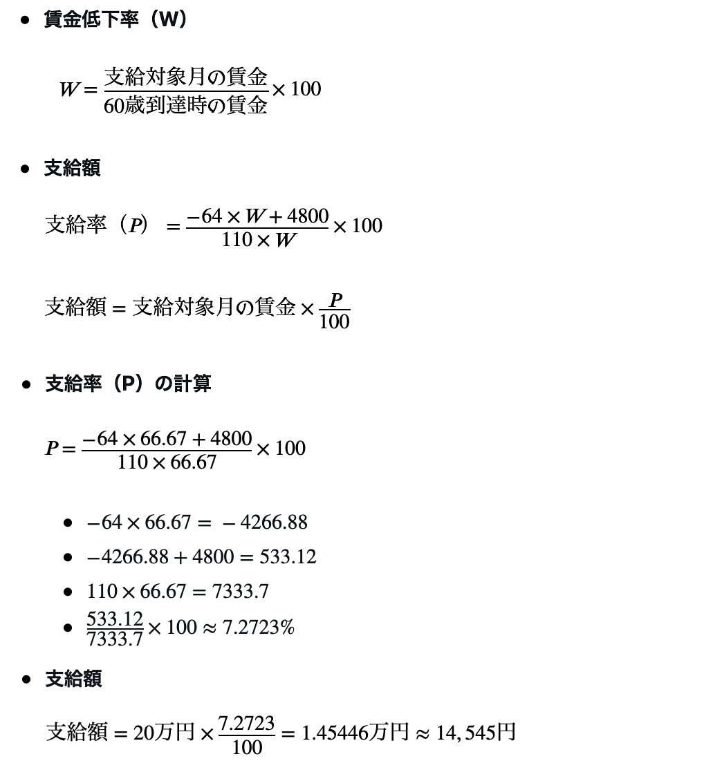 ※賃金低下率(w)が66.67%の場合の支給率、支給額の計算式は複雑ですが下記の通りです