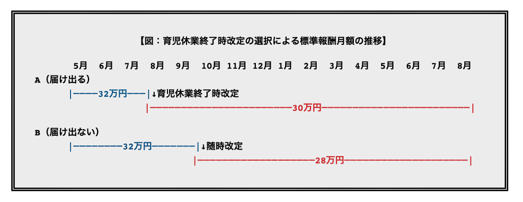 - A(育休終了時改定を届け出る):8月の育休終了時改定で標準報酬月額が30万円に下がり、翌年9月定時決定まで標準報酬月額が30万円継続と仮定。