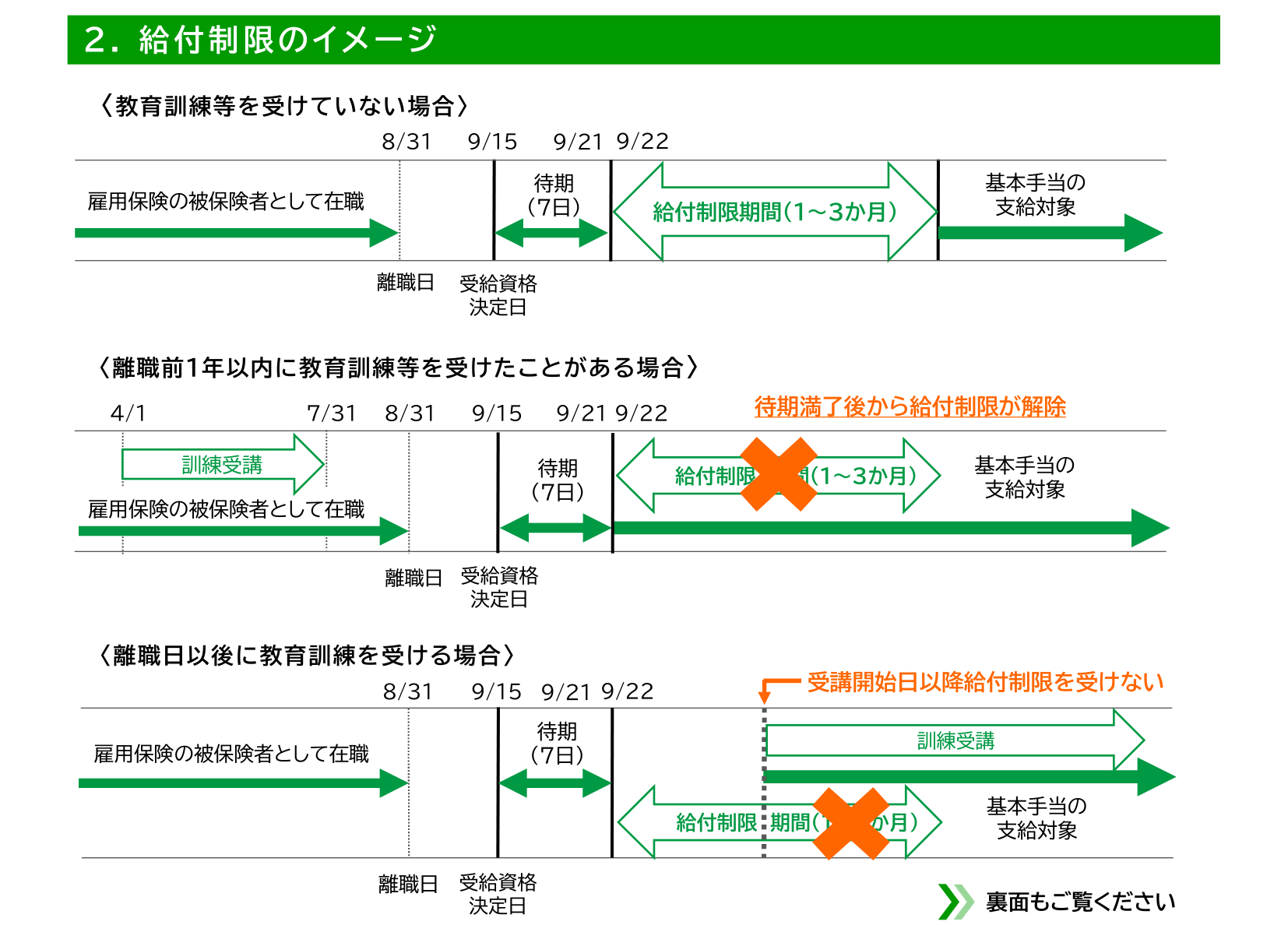 ※退職日が令和7年4月1日以降である場合は原則1か月、同年3月31日以前である場合は原則2か月です。ただし、退職日から遡って5年間のうちに2回以上正当な理由なく自己都合退職し受給資格決定を受けた場合、給付制限は3か月となります。