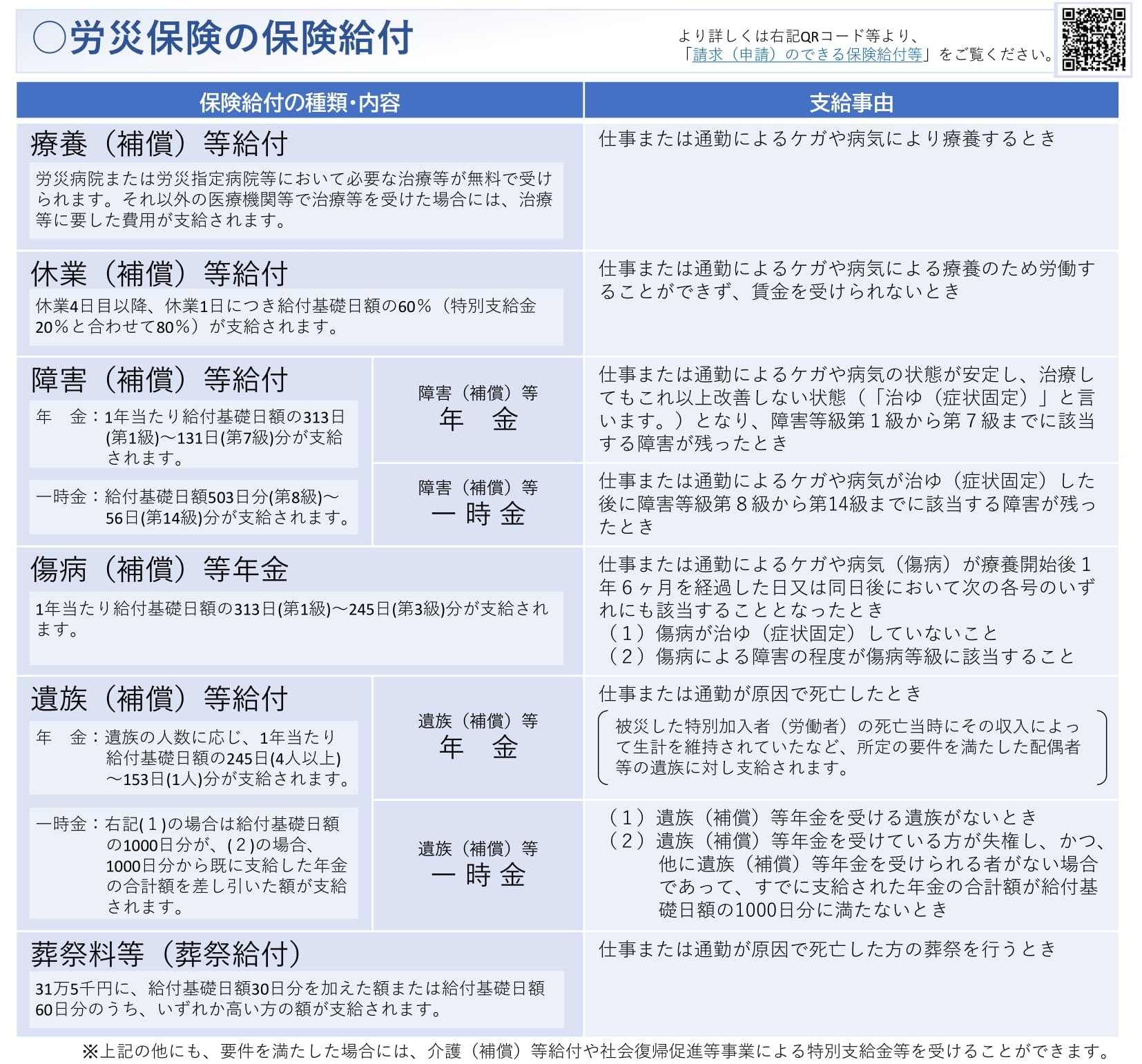 例:ケガで2ヶ月休業→休業4日目以降について休業補償給付が支給される - 障害・遺族補償:重大な障害が残った場合や死亡時に年金や一時金
