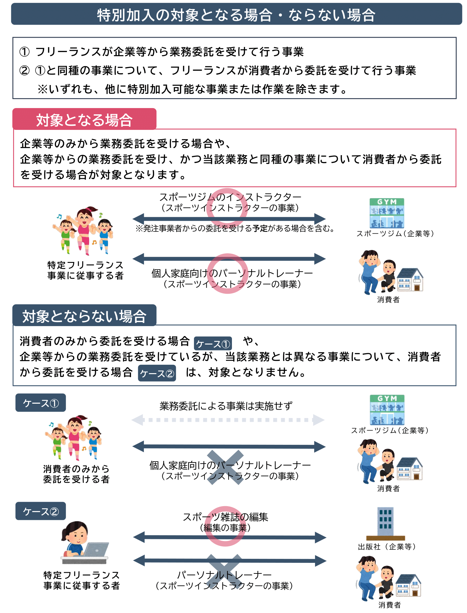 A:企業や消費者から委託された業務が対象。プライベートなケガや病気は対象外です。