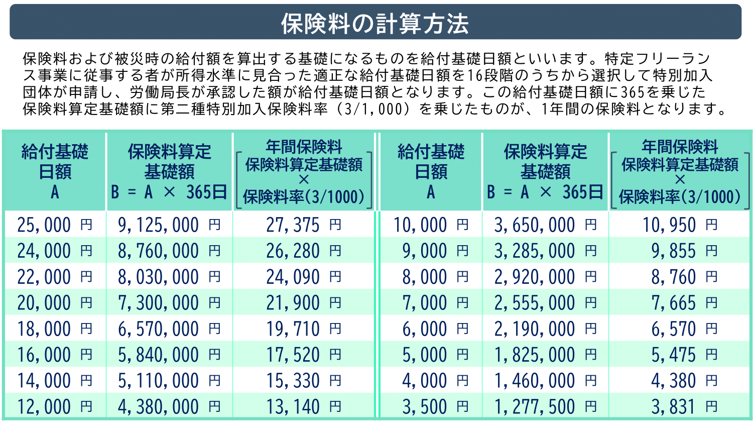 年間の保険料は、給付基礎日額に365を掛けた「保険料算定基礎額」に、事業ごとの保険料率を乗じて計算されます。保険料率は、事業の種類に応じて1,000分の3から52の範囲で設定されています。